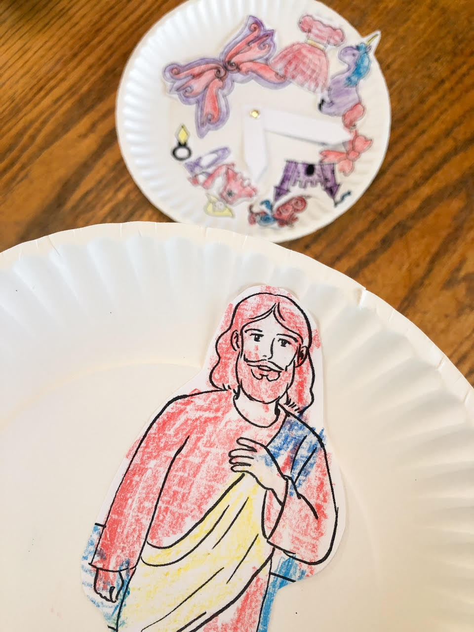 I’ve just discovered draw and print from my iPad pro through Adobe Sketch and it’s so much fun. I don’t have a copier, so this makes it easier to make 4 copies of our projects. For this activity, I asked the kids what their favorite things in the world are and drew simple images of them for a coloring page. I ended up with a girls’ sheet and a boys’ sheet. They were so excited to color all their favorite things. They also colored a picture of Jesus. After they had finished coloring, I cut out all of their pictures, gave them a glue stick and a paper plate. They glued each picture around the plate saying, “Trucks! I love trucks! Dinosaurs! I love dinosaurs!” – and so on. We talked about how all of these things are good things and how God gave us good things to enjoy and love. We put a clock face on this paper plate. These are the things that we fill up our days and time enjoying and doing. I gave them another paper plate and had them glue their Jesus to it. We set the Jesus plate on top of the favorite things plate. The visual was that Jesus is the most important thing. He comes first, by Himself over anything else.