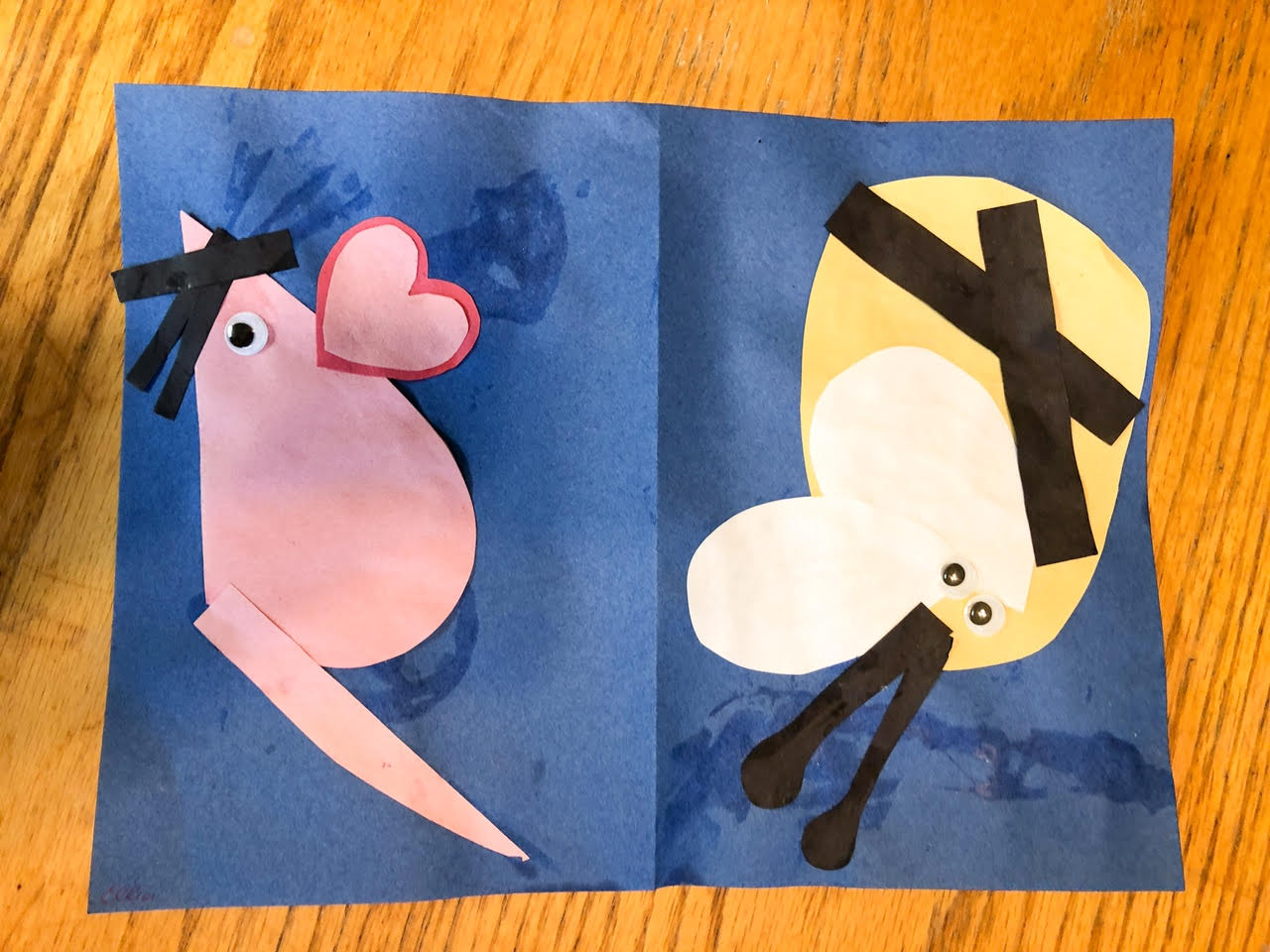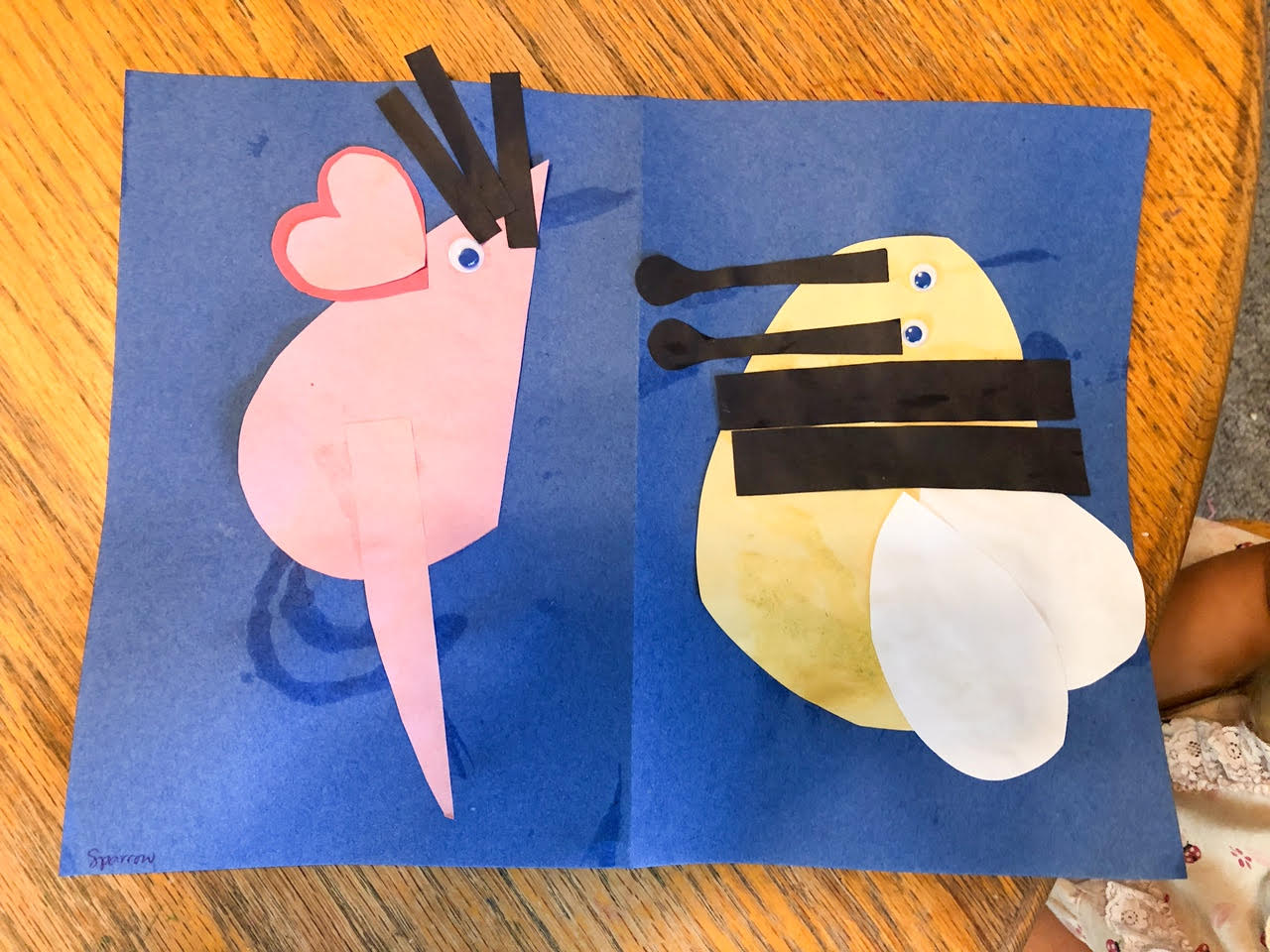 Each kiddo got a glue stick and a piece of paper. I gave them each shape one at a time, and told them what it was and where it went on their critter and let them arrange it how they wanted for their mouse and bee.