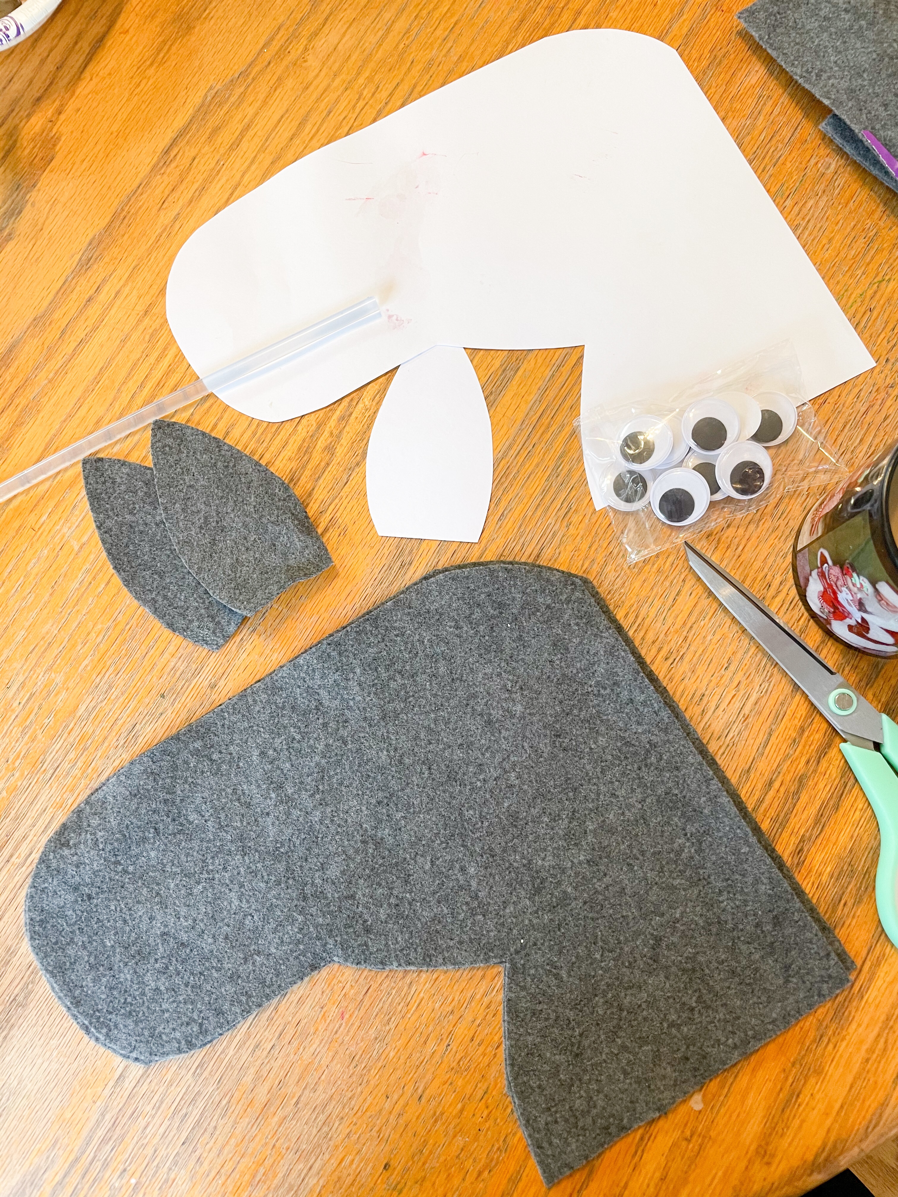 All you need is a dowel rod, 3 pieces of felt, stuffing of some sort (I used poly fil), a hot glue gun and googly eyes, I’m attaching a pattern for the donkey face. Print one copy, cut two felt pieces from each.