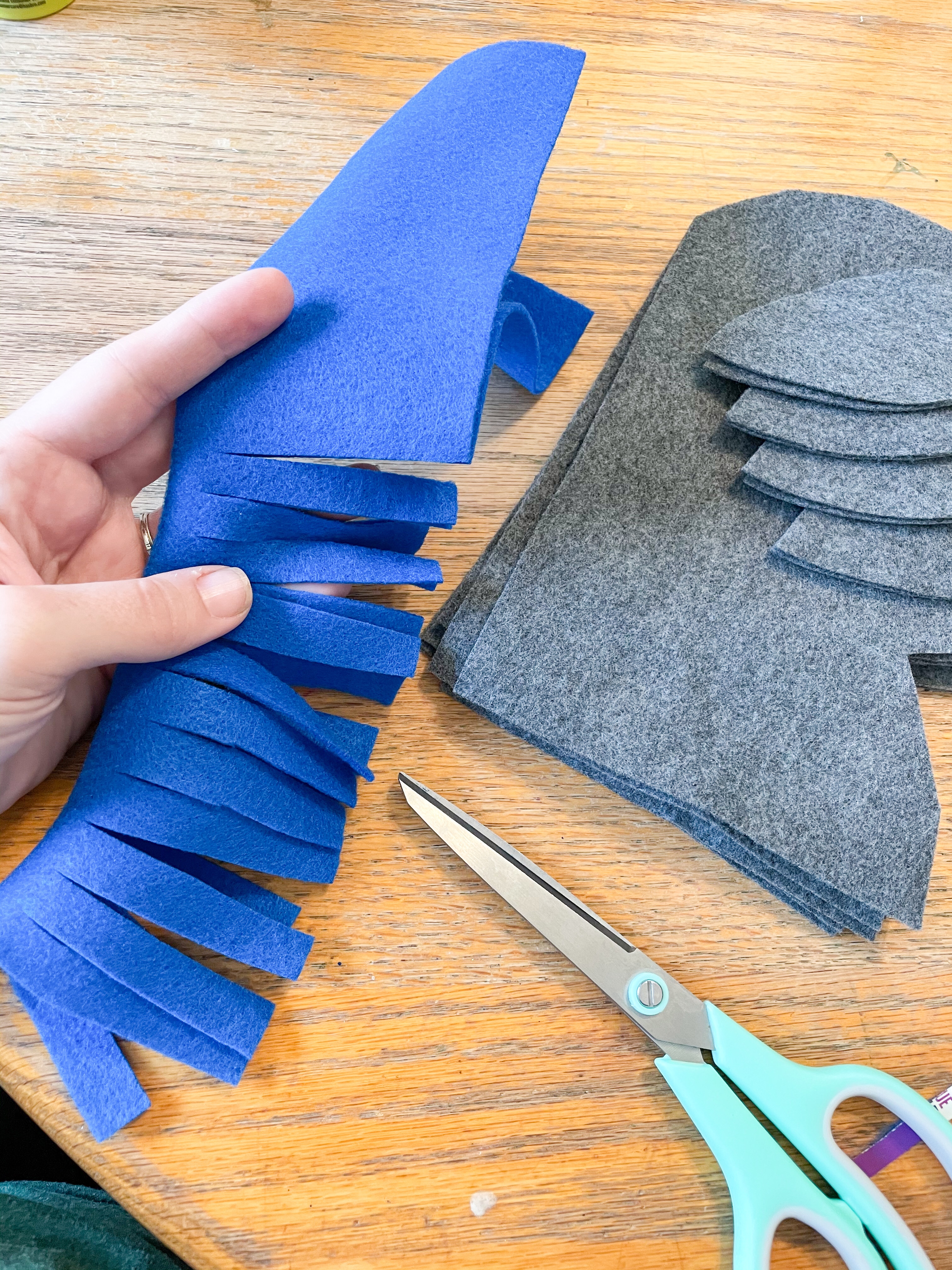 With your third sheet of felt, cut a strip 2/3s width. Fold in half and cut strips (careful not to cut all the way through, leave approx. 1/2 inch intact.) Hot glue face pieces together, only around the edges, leaving the bottom of the neck open for stuffing. Fill to your liking. Insert dowel rod. Push it all the way up to touch the inside top of the head, and add extra stuffing as needed for support. Glue closed. Put a dot of glue at the bottom middle edge of each ear and pinch to form a slightly “cupped” ear. Glue ears and eyes to donkey. Position felt mane over donkey’s neck and hot glue so draped both sides. Done!