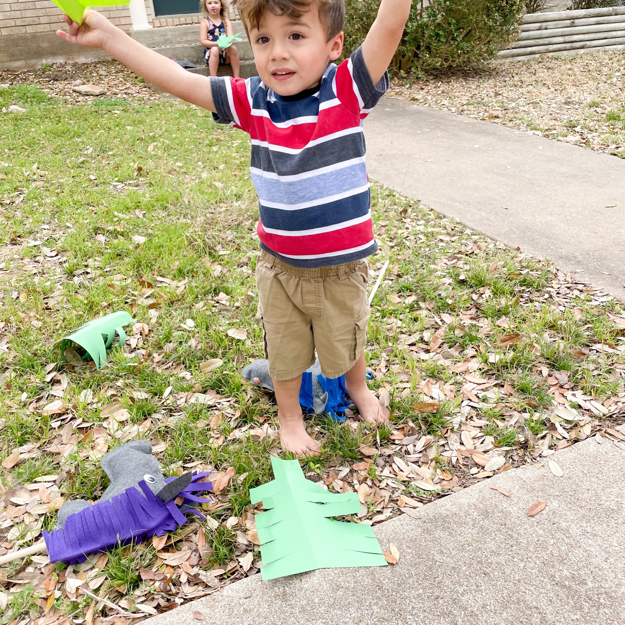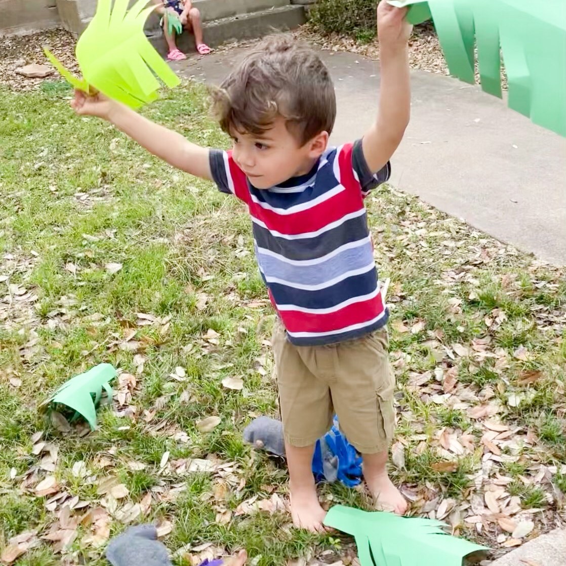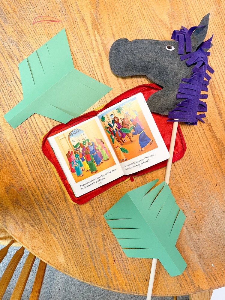 After we read and talked through the story, we collected our palm branches and donkeys and headed outside to take turns acting out the story. One child would ride down the sidewalk, while everyone else lined the streets calling, “Hosanna! God save! Here comes Jesus!”